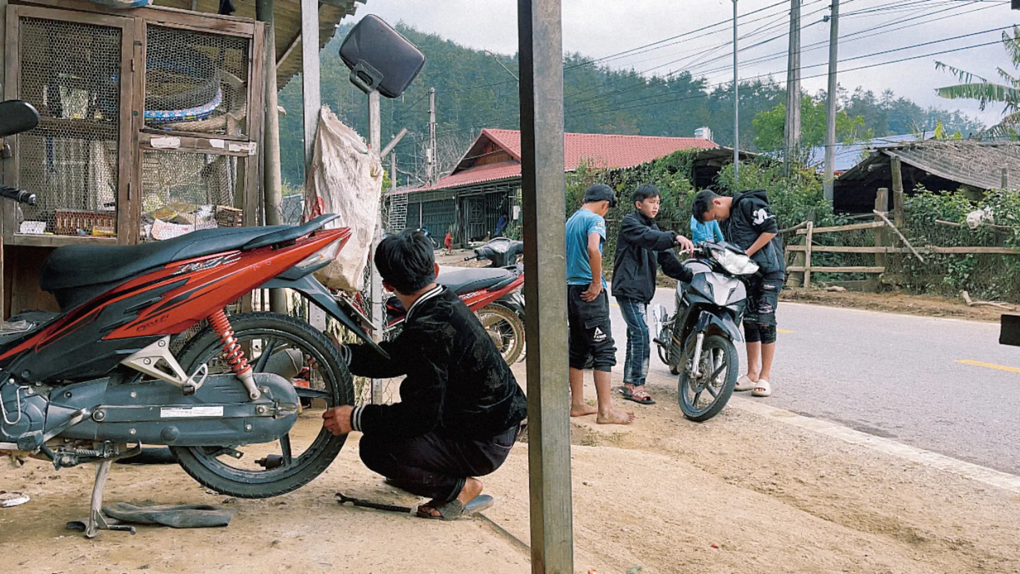 Chúng tôi đã thử cố gắng đi xe lên, nhưng con đường dốc đứng và liên tục ôm cua gắt khiến mọi nỗ lực trở nên bất khả. Bánh xe trượt nhẹ trên mặt đường xi măng lạnh ẩm, tay lái chòng chành giữa những khúc quanh gấp khúc, buộc chúng tôi phải dừng lại. Cuối cùng, chúng tôi đành xuống xe, chấp nhận rằng đoạn đường này không dành cho việc tự lái và tìm đến sự giúp đỡ của những người bản địa dưới chân núi.